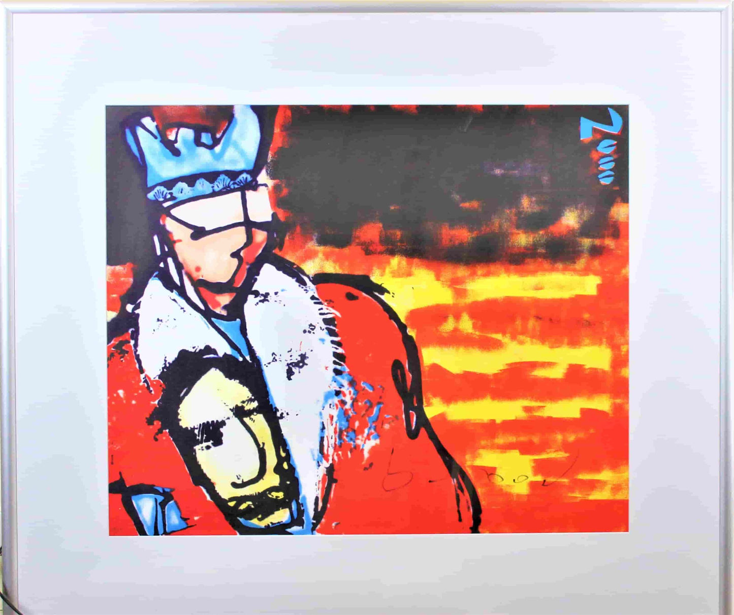 The screen print is framed in a wide aluminum frame measuring 120 * 105 cm